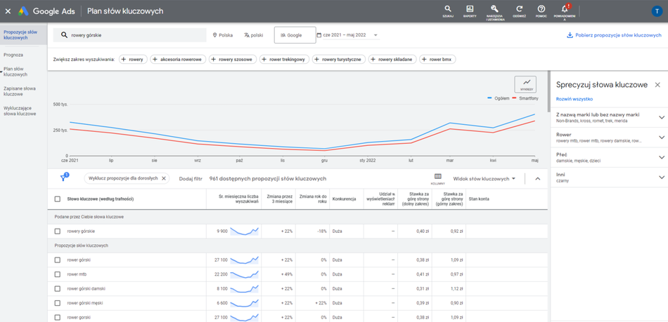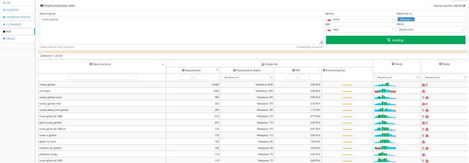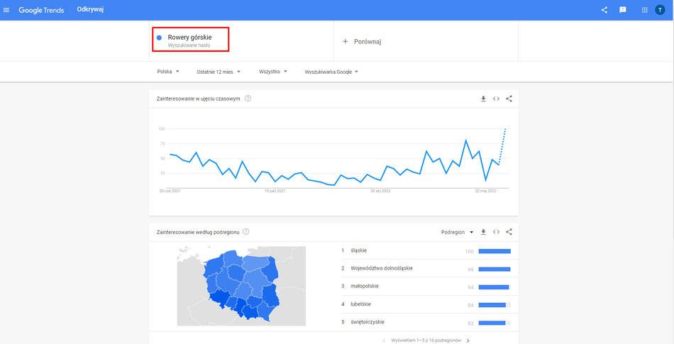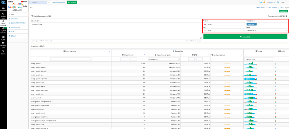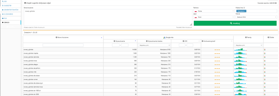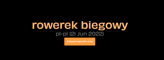 Chcąc dokonać analizy, wystarczy w odpowiednie pole wpisać naszą frazę, wybrać kraj oraz kliknąć wyszukaj. Jednocześnie możemy zweryfikować do pięciu fraz. Warto jednak pamiętać, aby były zbliżone tematycznie np.: rowery górskie, damskie rowery górskie, męskie rowery górskie, rowery MTB i podobne.