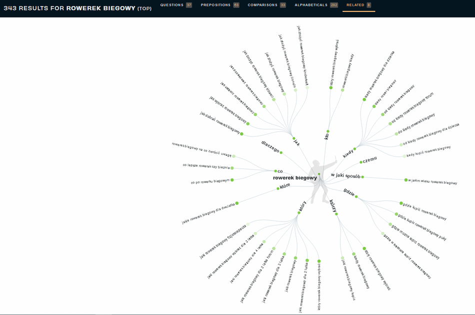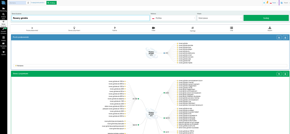 Otrzymujemy wyniki z takich wyszukiwarek jak Google i Bing, w formie kołowego wykresu i listy słów kluczowych z przyimkami oraz zbiór pytań ułożonych alfabetycznie.