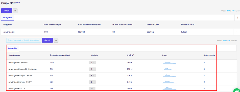 Otrzymane frazy posiadają ilość wyszukiwań oraz stawki CPC i trendy popularności. Dodatkowo każdą frazę możemy zweryfikować pod kątem wariacji.