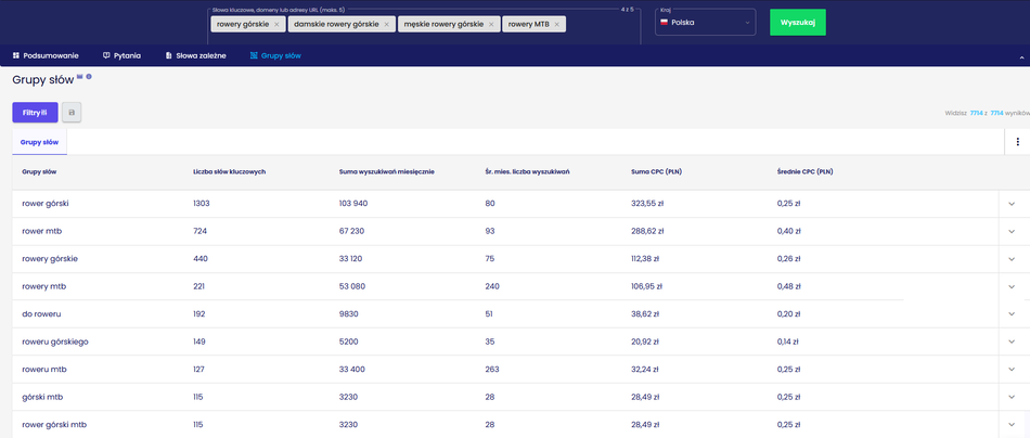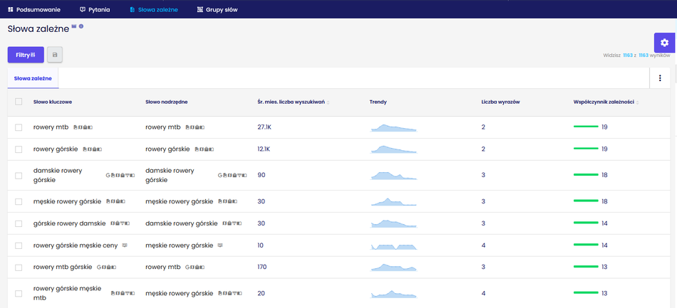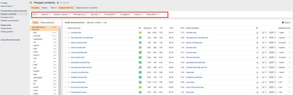 Otrzymane wyniki mamy możliwość odfiltrować na wiele sposobów, co znacznie ułatwia odnalezienie najbardziej wartościowych dla nas fraz.