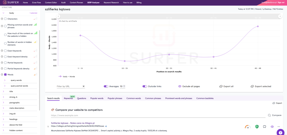 - Poszukując słów kluczowych, warto wykorzystać narzędzie SurferSEO, które dopasuje do naszej frazy również słowa kluczowe, na które wyświetla się minimum 2 konkurentów spośród stron w TOP 20. W ten sposób dooptymalizujemy stronę na frazy konkurenta i zyskamy szansę na poprawę widoczności swojej oferty.