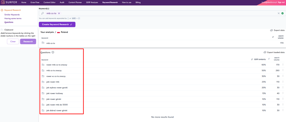 - Listę pytań na podstawie naszego słowa kluczowego,