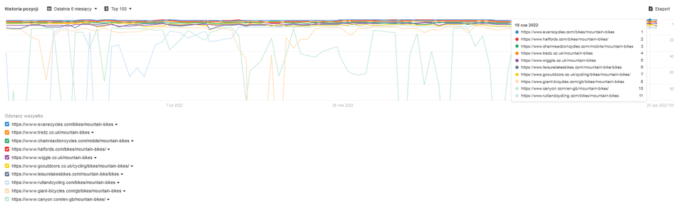 Co więcej, otrzymujemy historię zmian pozycji stron konkurencji, na podaną przez nas frazę z TOP 10 do TOP 100.