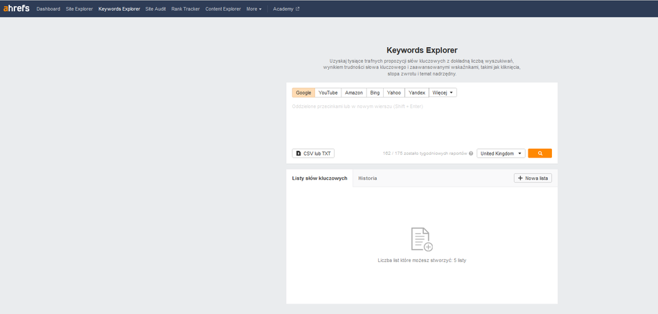 W celu przeprowadzenia analizy słów kluczowych należy wybrać opcję Keyword Explorer z głównego menu Ahrefs.