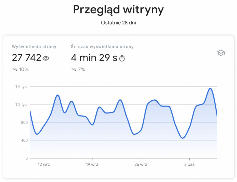 Jest to pierwsza informacja jaką zobaczymy. Posiada ładną oprawę w postaci błękitnego prostokąta z wielkimi cyframi. Problem jednak w tym, że nie do końca wiem co te „Wyświetlenia strony ogółem” oznaczają. Próba zestawienia tej liczby z wyświetleniami w Google Search Console oraz Google Analytics - spełzły na niczym. Nie za bardzo jest to również gdzieś opisane. Pocieszający jest jednak fakt, że dane te nie są specjalnie interesujące, mają bardziej charakter „miary próżności” - fajnie że rośnie, ale przełożenia brak.