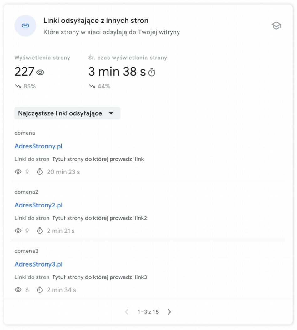 Kolejna sekcja zawiera „Linki odsyłające z innych stron” z podziałem na: