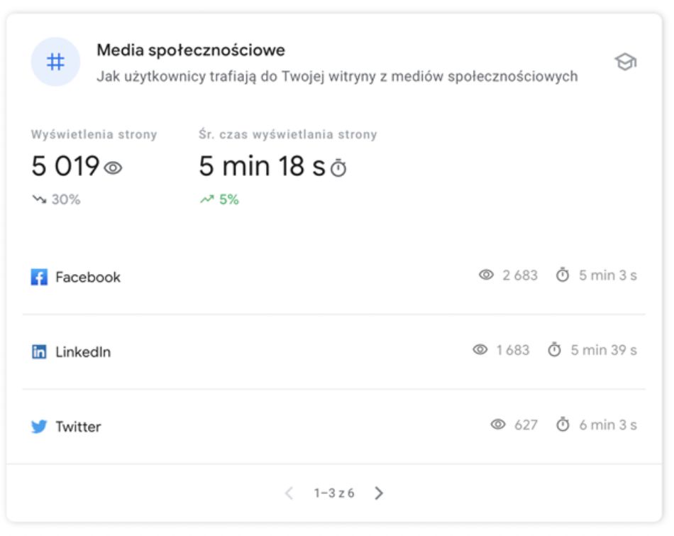 Ostatnia sekcja dotyczy mediów społecznościowych. Dane w niej zawarte wyglądają identycznie jak w sekcji dotyczącej linków odsyłających. Z tą tylko różnicą, że informacje odwołują się do statystyk Facebooka, Linkedina oraz wyświetleń i średniego czasu na stronie, jaki wygenerowały.