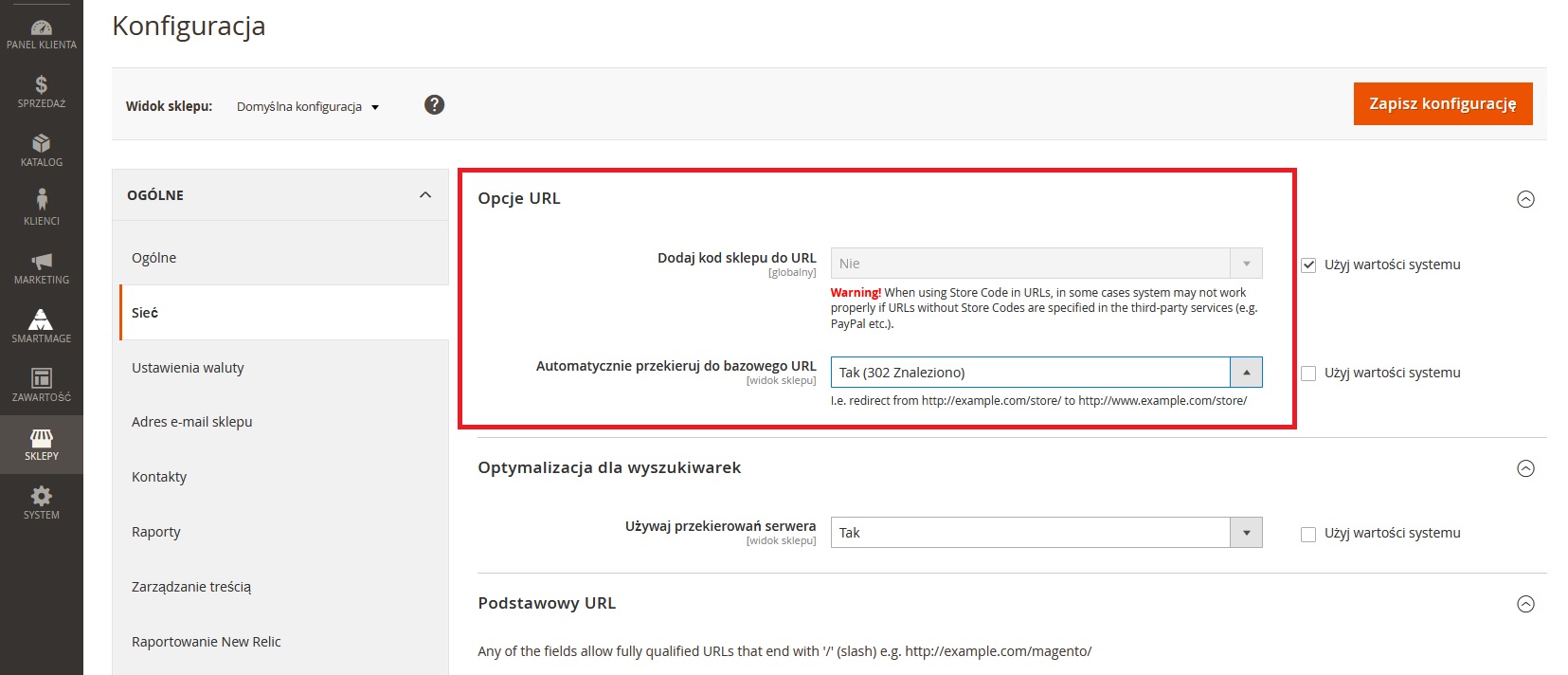 Ważne: zmiana ustawień na wyższym poziomie wpływa na widok wszystkich niżej usytuowanych elementów, dlatego powinieneś zachować szczególną ostrożność. - W sekcji Opcje URL znajdziesz pole Dodaj kod sklepu do URL. Zachowaj wartość domyślną: Nie, aby adresy URL były opisowe i łatwe do odczytania.