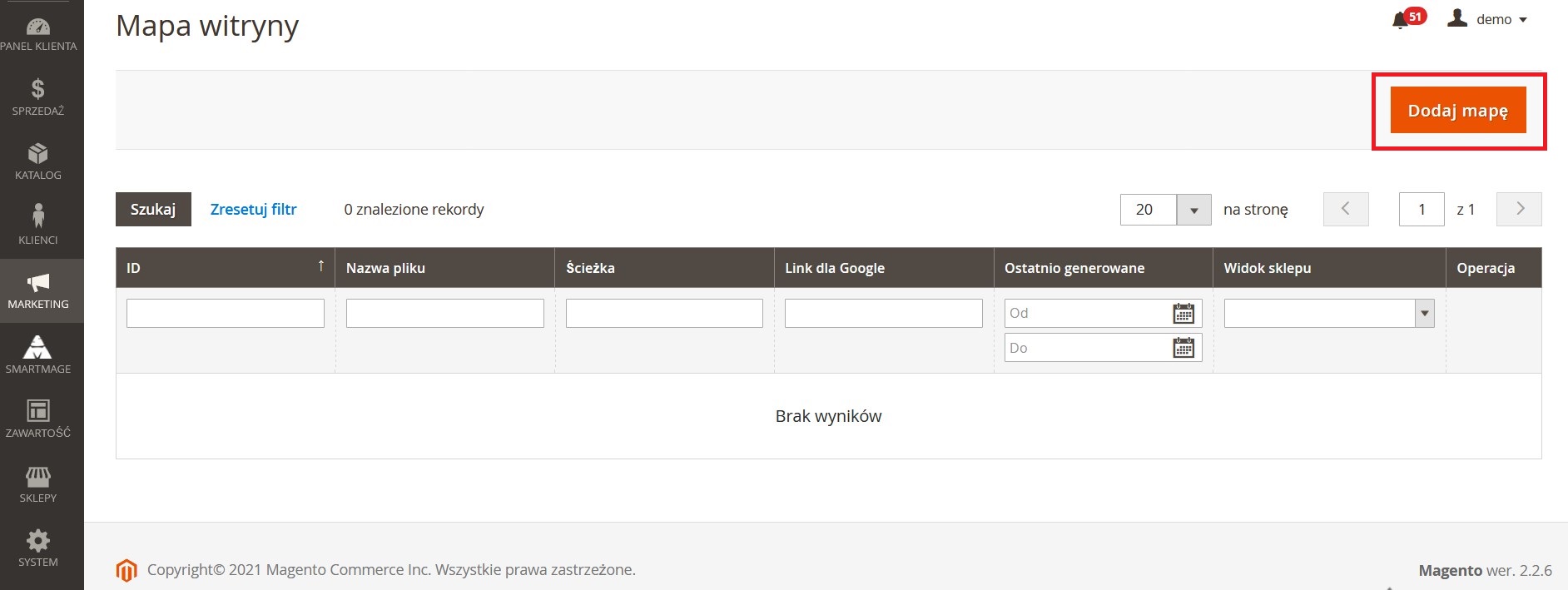 Po skonfigurowaniu wszystkiego nadszedł czas, aby utworzyć mapę witryny XML i skonfigurować ustawienia jej (ponownego) generowania. Aby to zrobić, przejdź do Marketing> Mapa witryny i kliknij pomarańczowy przycisk Dodaj mapę.