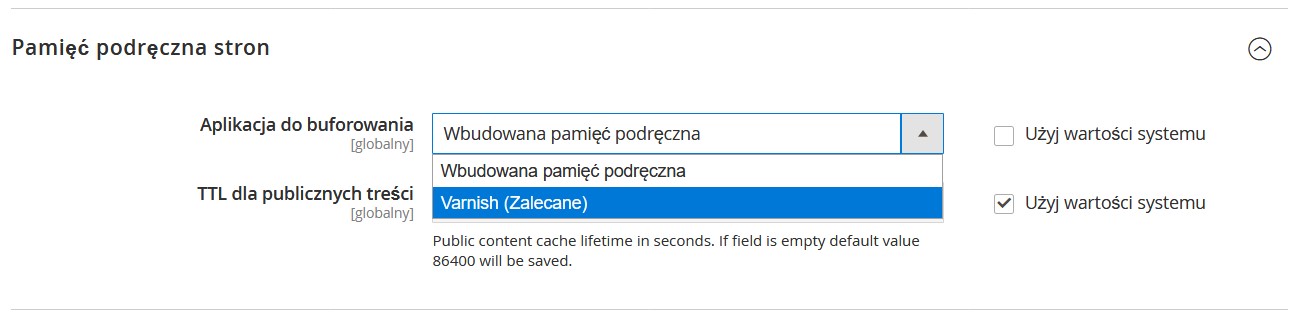 Znajdź sekcję Pamięć podręczna stron i zmień wartość Wbudowana pamięć podręczna na Varnish. Varnish – nazywany akceleratorem front-endu to jeden z rodzajów reverse proxy, który w kilka ms zwraca odpowiedź na zapytanie użytkownika.