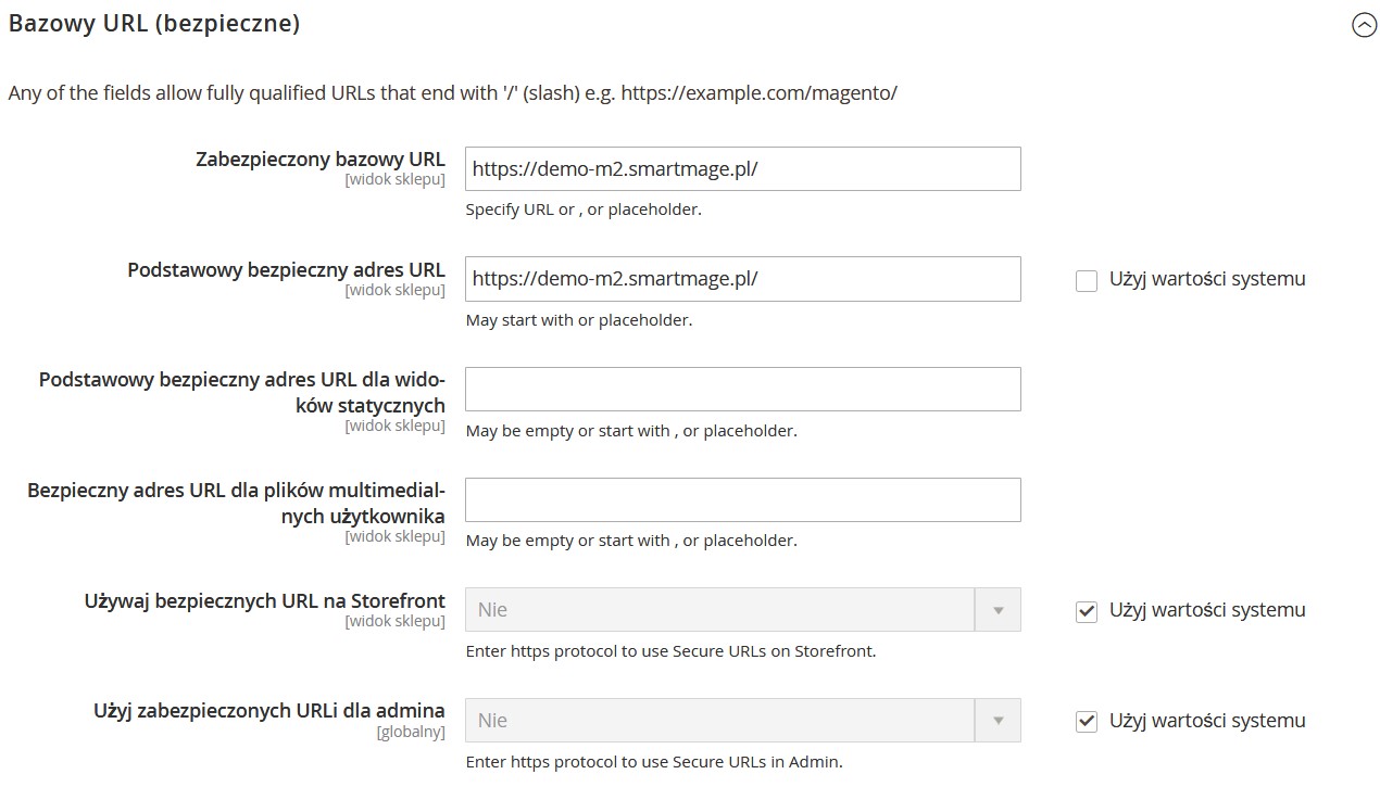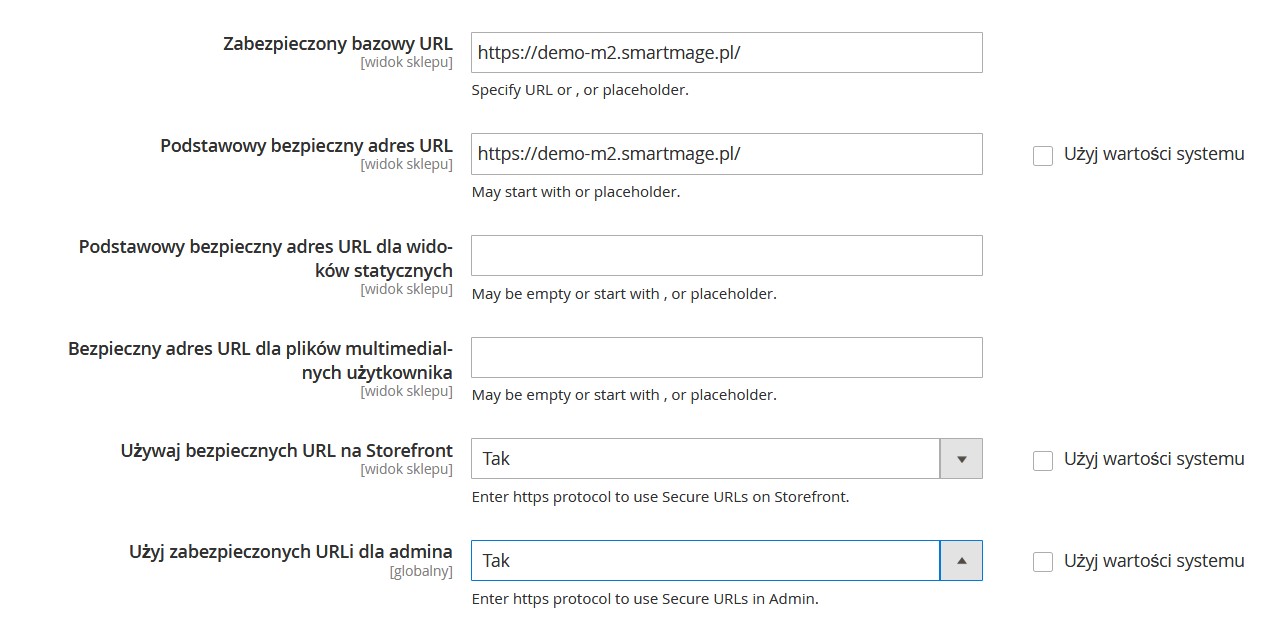 Ponadto zmień wartość pól Używaj bezpiecznych URL na Storefront, oraz Użyj zabezpieczonych URLi dla admina na Tak