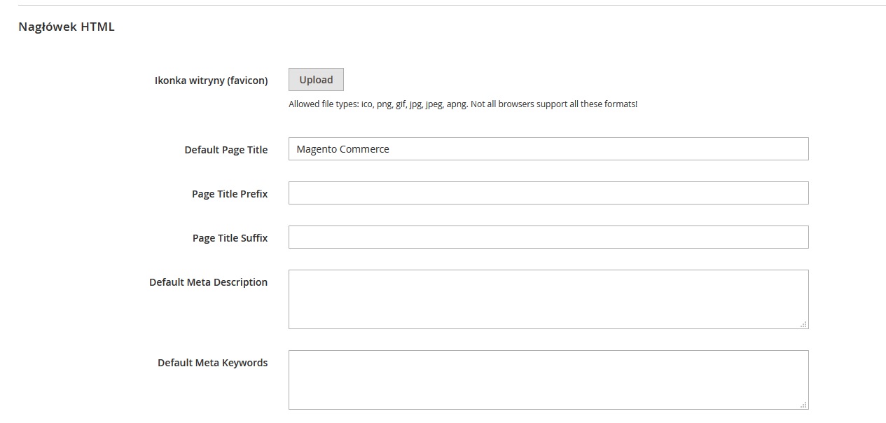 Możesz zignorować pola Default Page Title i Default Meta Description, ponieważ nie są one domyślnie używane w Magento. Zignoruj również Default Meta Keywords.