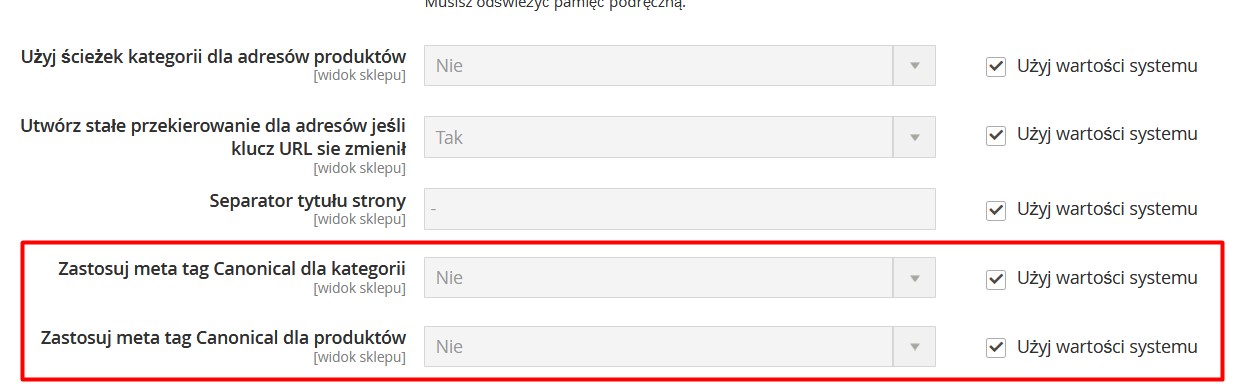 - Na ekranie, który zostanie załadowany, znajdziesz pola o nazwach Zastosuj meta tag Canonical dla kategorii i Zastosuj meta tag Canonical dla produktów. Zmień ich wartości na Tak. Spowoduje to, że zarówno strony produktów, jak i kategorii produktów będą miały kanoniczne adresy URL, co znacznie pomaga zapobiegać powielaniu treści.