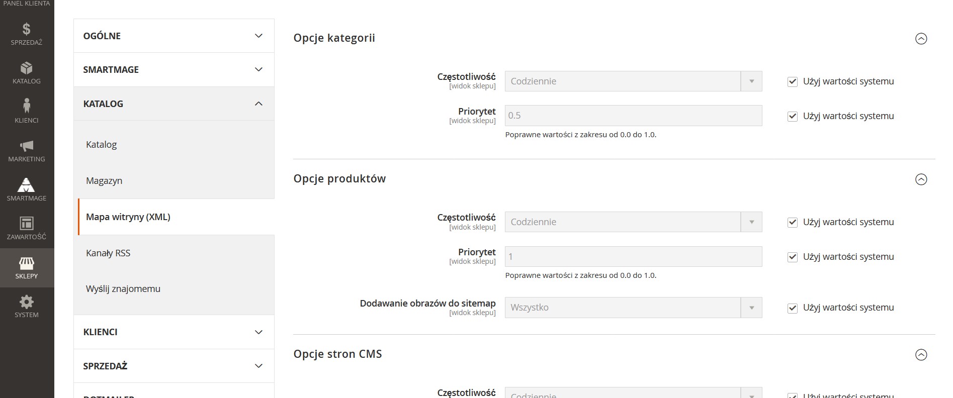 Domyślnie opcje kategorii, produktów i stron CMS są skonfigurowane poprawnie. Google nie korzysta ze wskazówek dotyczących częstotliwości i priorytetów, więc nie ma potrzeby niczego tam zmieniać. Domyślnie obrazy są również zawarte w mapie witryny XML.