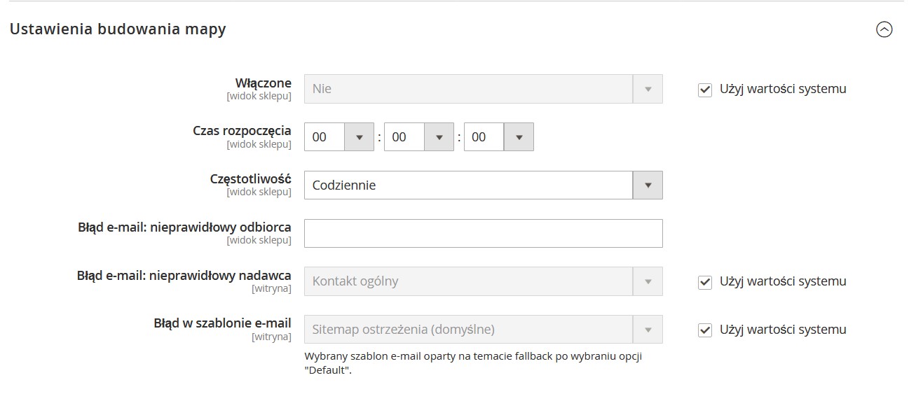 U góry strony wybierz Domyślna konfiguracja widoku sklepu, aby zarządzać ustawieniami generowania mapy witryny XML. Strona zostanie ponownie załadowana, a gdy przewiniesz trochę w dół, zobaczysz, że możesz określić, czy, kiedy i jak często mapa witryny XML ma być ponownie generowana w Ustawieniach budowania mapy.