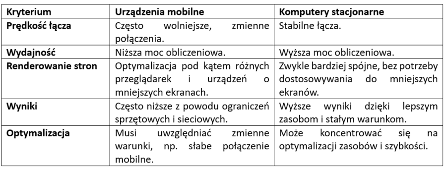 Musimy pamiętać, że urządzenia mobilne, z uwagi na ograniczenia sprzętowe i zmienność warunków sieciowych, zwykle uzyskują gorsze wyniki niż komputery stacjonarne. Dlatego optymalizacja powinna uwzględniać specyfikę obu wersji, aby zapewnić jak najlepsze doświadczenia użytkownikom na każdym urządzeniu.