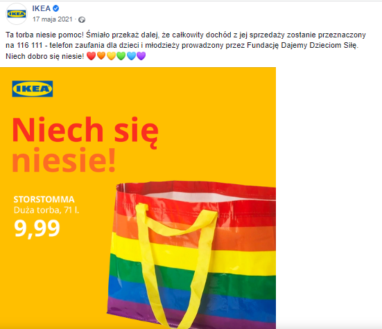 Przykładem akcji tego typu była m.in. ta, którą marka IKEA podjęła na rzecz pomocy fundacjom, wspierającym środowiska LGBT+. W ramach działań IKEA wprowadziła do sprzedaży specjalny produkt - torbę w kolorach tęczy, o nazwie STORSTOMMA, wzorowaną na kultowej niebieskiej odpowiedniczce, powszechnie znanej klientom sklepu. Dochód ze sprzedaży toreb, w każdym z krajów, w których obecna jest sieć, został przeznaczony dla organizacji, które pomagają osobom LGBT +. W Polsce była to fundacja Dajemy dzieciom siłę.
