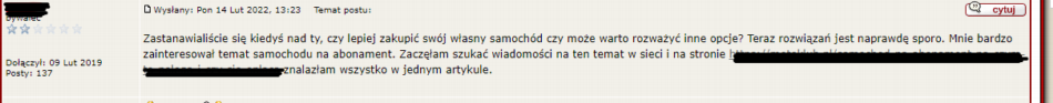 W poniższym przykładzie użytkowniczka zachęca innych do odwiedzenia strony, linkując artykuł (tak, marketing szeptany na forach, często łączy się z działaniami z obszaru SEO, takimi jak link building). We wpisie użyto jednak zwrotu - „znalazłam wszystko w jednym artykule”, co jest mało realne, a tym samym - mało naturalne i może wzbudzać podejrzenia co do wiarygodności i intencji tej opinii. Dodatkowo - wpis ten pojawił się na forum, które w całości miało być poświęcone tematom związanym z organizacją ślubów, co także wydaje się być nienaturalnym działaniem. Pisanie / linkowanie w miejscach, które nie są tematycznie związane z danym produktem - to błąd. Wpisy takie, jak poniższy to przykład tzw. szeptanki.