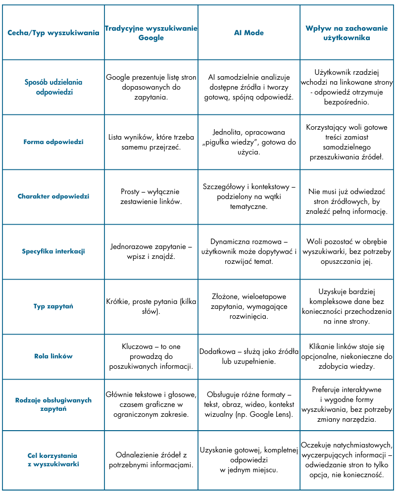 AI Mode upraszcza dostęp do informacji. Użytkownik otrzymuje gotową, syntetyczną odpowiedź i często nie musi klikać w żaden link. To ma trzy fundamentalne konsekwencje dla biznesu: