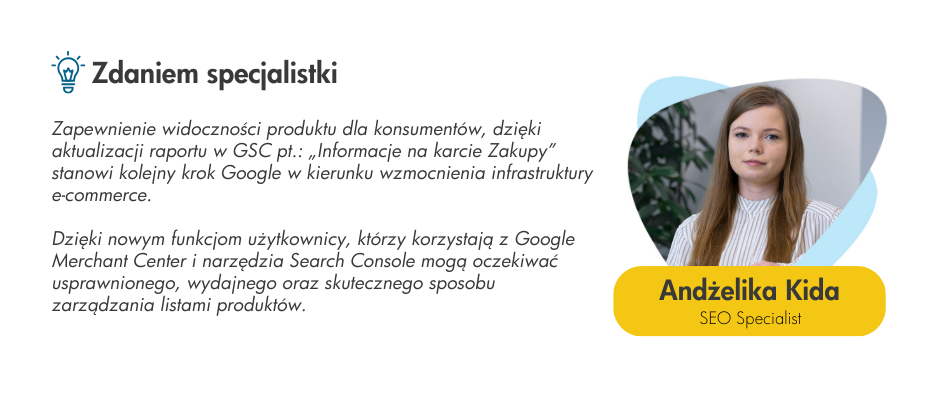 Pod koniec 2022 roku, do narzędzia Google Search Console wprowadzono nowy raport znany, jako „Informacje na karcie Zakupy". Raport ten umożliwiał użytkownikom prostsze zgłaszanie swoich produktów do Merchant Center. Teraz został zaktualizowany i przekształcony w zupełnie nową funkcję.
