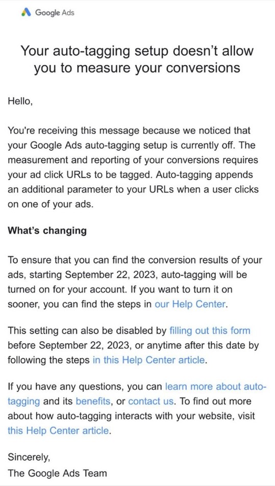 Firma Google wysłała do reklamodawców wiadomość e-mail, w której informuje, że włączy automatyczne tagowanie, jeśli zostało ono wcześniej wyłączone. Aby temu zapobiec, należy wypełnić specjalny formularz.
