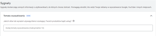 W kampanii Performance Max pojawiła się możliwość dodania maksymalnie 10. tematów wyszukiwania – słów lub wyrażeń, których mogą używać klienci, poszukujący danych produktów bądź usług.