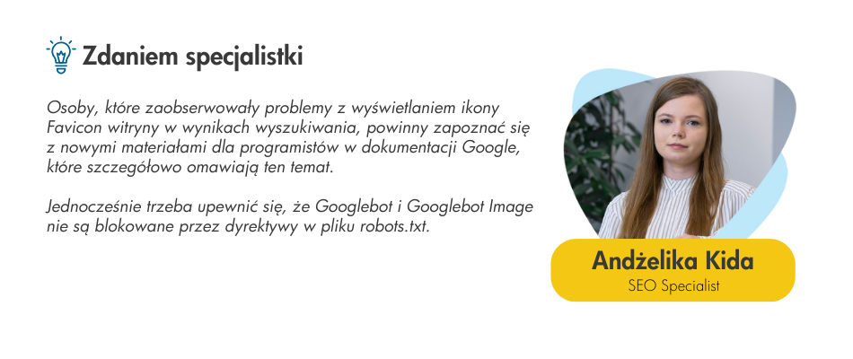 Jeśli chcemy zatem zadbać o widoczność i indeksowanie faviconów, to zarówno ich plik, jak i strona główna serwisu muszą być dostępne dla Googlebota i Googlebota-Image.