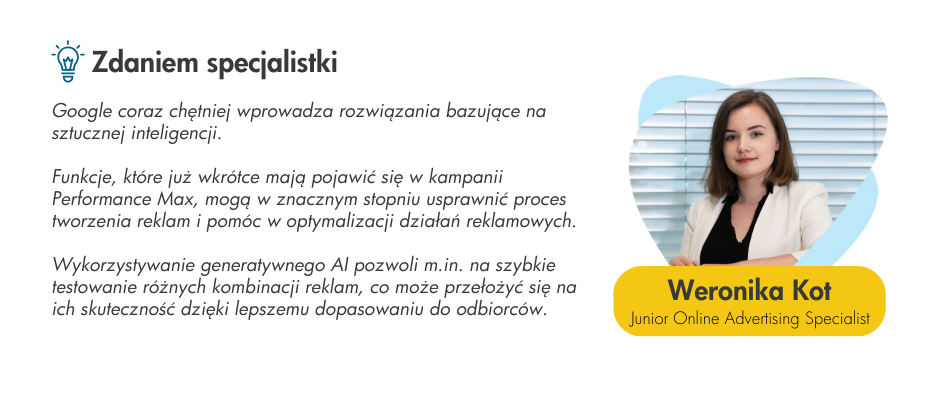 Więcej: https://blog.google/products/ads-commerce/get-creative-with-generative-ai-in-performance-max/?fbclid=IwAR1ltZW0N3poCS6XzMbjYU2tQCHqi8Jn4eBDwwTmyXmstHhWKvLwQiP4_Oc