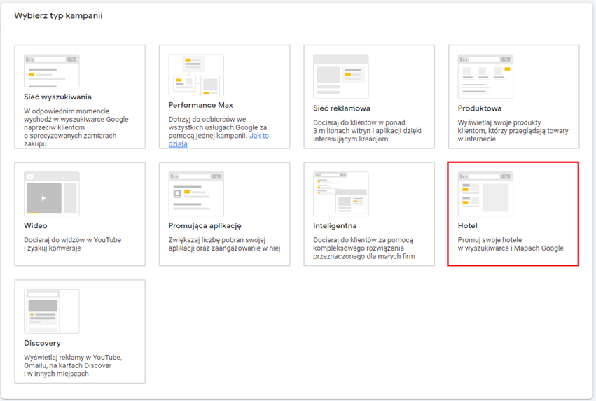Kampania promująca hotele w Google Ads