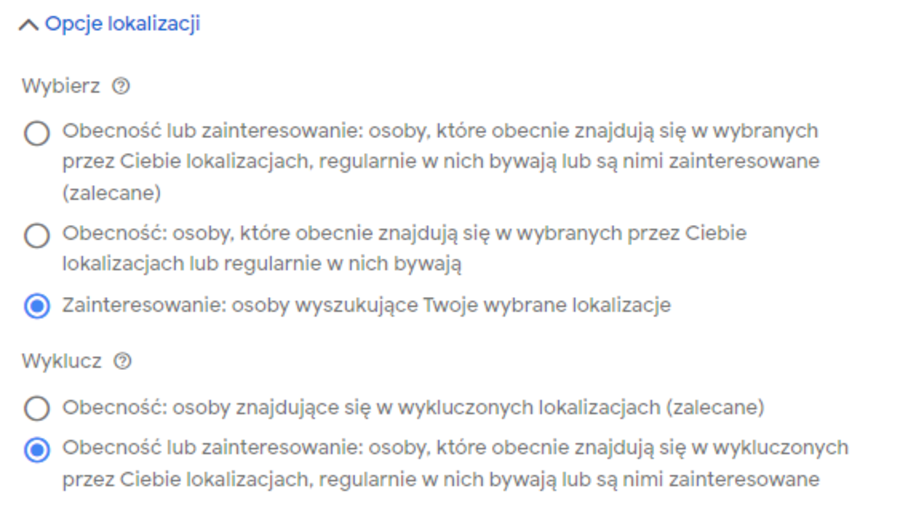 Wprowadzone zmiany spowodują, że ostatnia opcja lokalizacji, czyli zainteresowanie, nie będzie już możliwe do wykorzystania w kampaniach reklamowych. Jeżeli marki w swojej strategii reklamowej korzystały z tej opcji, Twoje kampanie będą teraz kierowane z wykorzystaniem opcji obecność lub zainteresowanie.