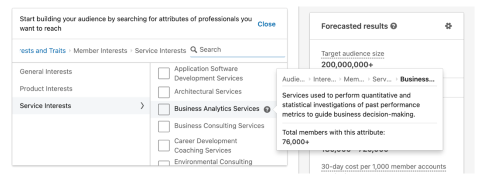 Zainteresowania usługami pozwalają na kierowanie reklam do osób, które wyszukiwały lub przeglądały strony związane z konkretnymi usługami na LinkedIn. Aktualnie dostępnych jest 20 różnych kategorii usług, które możesz wykorzystać w swoich kampaniach reklamowych.