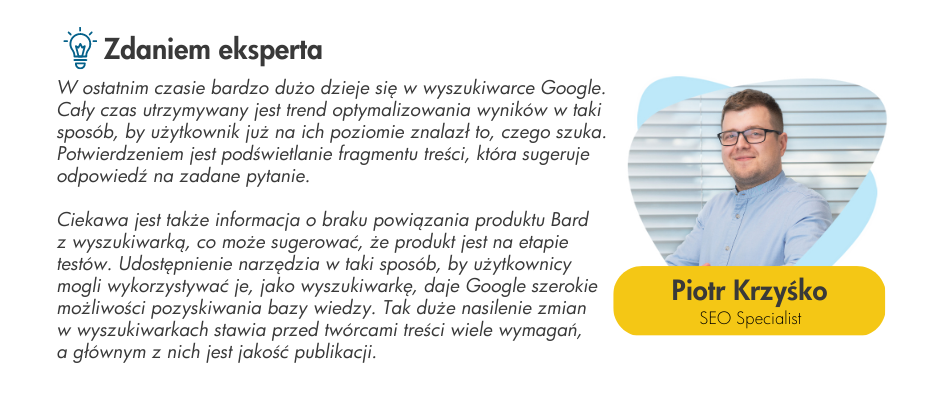Google pospiesznie wprowadziło produkt pod nazwą Bard, co miało być odpowiedzią na wdrożenie integracji Bing z ChatGPT. Użytkownicy uznali to za nową funkcjonalność wyszukiwarki Google. Jak można się jednak dowiedzieć z oficjalnych wypowiedzi lidera produktu Bard, jest to całkowicie osobny produkt, niemający wpływu na wyniki wyszukiwania. Mimo że Bard jest wykorzystywany przez użytkowników, jako wyszukiwarka, to nią nie jest i nie ma z nią żadnego związku. Możemy jednak spodziewać się bardziej zorientowanych na wyszukiwanie działań w Bard, co może prowadzić do wielu zmian w optymalizacji treści i stron.