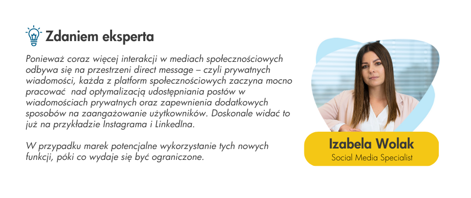 Meta zaobserwowała, że coraz więcej działań związanych z udostępnianiem zdjęć i filmów na Instagramie odbywa się za pomocą wiadomości prywatnych, dlatego pracuje nad wprowadzeniem większej liczby funkcji, dostępnych w tych wiadomościach.