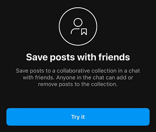 Nowa opcja udostępniania postów na Instagramie umożliwia użytkownikom rozpoczęcie prywatnej dyskusji, na podstawie postu za pośrednictwem „kolekcji współpracy”, do której każdy użytkownik czatu może dodawać wpisy. To nowy sposób na skupienie zaangażowania wokół postów, w przeciwieństwie do udostępniania ich jednej osobie lub kopiowania linku.