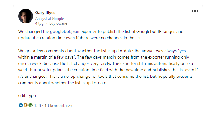 W 2021 roku w sieci pojawiła się oficjalna lista adresów IP Googlebotów. Google zapewniło, że dokumentacja będzie na bieżąco odświeżana. Ponadto zachęcało nas do korzystania z dokumentacji w celu filtrowania ruchu. Od tamtego ogłoszenia minęło już trochę czasu, a plik JSON ze wspomnianymi adresami wydawał się nieaktualizowany. Sugerowała to głównie data jego stworzenia. W związku z powyższym w sieci zaczęły pojawiać się pytania i wątpliwości użytkowników, które postanowił rozwiać Gary Illyes, zajmujący stanowisko Analityka w Google. Zamieścił on następujący post na LinkedInie: