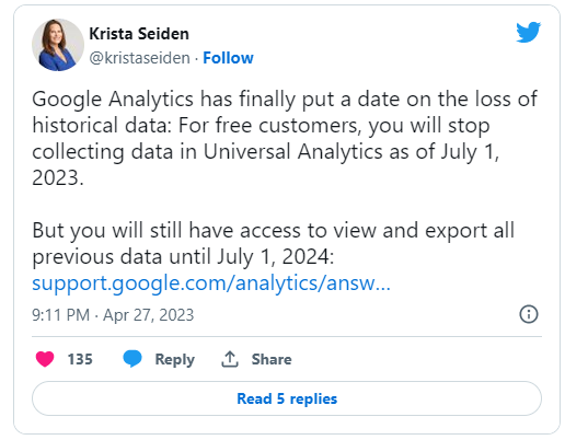 Google poinformowało, że użytkownicy będą mieli dostęp do danych historycznych do lipca 2024 roku, jednak zaleca ich eksport z Universal Analytics, przed dniem wycofania platformy (01.07.2024). Po tym terminie nie będzie możliwości przetwarzania danych, a dostęp do interfejsu zostanie zablokowany.