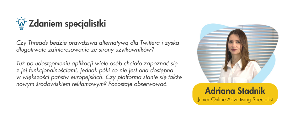 Threads, nowa aplikacja społecznościowa obsługiwana przez Metę, ogłoszona jako alternatywa dla Twittera. Od chwili uruchomienia aplikacji, stała się ona 5. najszybciej rozwijającą się platformą mediów społecznościowych. Na ten moment reklamodawcy nie mają możliwości zakupu przestrzeni reklamowej w aplikacji. Zespół Instagrama pracuje jednak nad udostępnieniem narzędzi do tworzenia treści w niezbyt odległej przyszłości, a reklamy mają zostać wprowadzone, gdy tylko Threads osiągnie odpowiedni poziom użytkowników.