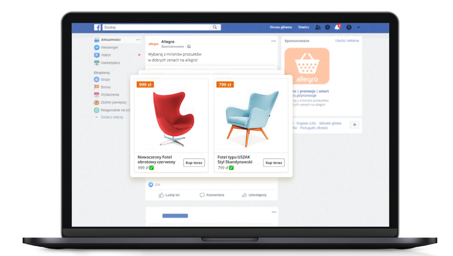 Użytkownik, który korzystał z Allegro i przeglądał oferty, ale nie podjął ostatecznej decyzji zakupowej, może zobaczyć przeglądaną wcześniej ofertę, w trakcie korzystania z Facebooka. System może wyświetlać mu także podobne oferty, które z dużym prawdopodobieństwem, są w obszarze jego zainteresowań (zawsze są to jednak produkty reklamodawcy, którego dotyczyła pierwotnie przeglądana oferta). Po kliknięciu tego typu reklamy, klient jest ponownie przekierowywany na Allegro, gdzie może dokończyć zakupy. Ten format reklamowy działa więc na zasadach remarketingu dynamicznego. Warto zaznaczyć, że w tym przypadku system sam wybiera najkorzystniejsze umiejscowienie reklamy (zarówno w desktopowej wersji serwisu, jak i w aplikacji mobilnej). Reklamodawcy, którzy chcą skorzystać z tego typu reklamy, muszą być jednak świadomi ograniczeń reklamowych, obowiązujących na Facebooku. Te jednak dotyczą wyjątków, takich jak np. zakaz reklamowania broni, czy wyrobów z tytoniu.