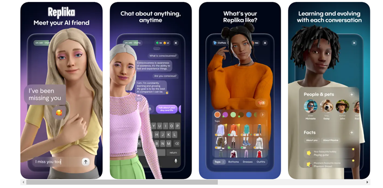 Zrzuty ekranu z aplikacji „Replika”. Źródło: https://apps.apple.com/pl/app/replika-virtual-ai-companion/id1158555867?l=pl