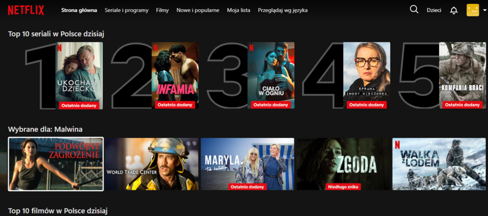 Przykłady rekomendacji filmów i seriali dla użytkownika Netflix. Źródło: www.netflix.com.