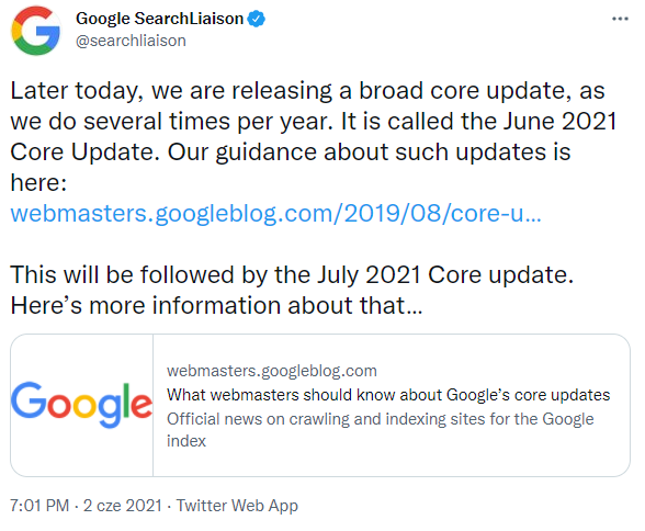 Pod koniec drugiego kwartału 2021 roku na profilu Google Search Liaison mogliśmy zapoznać się z oficjalną informacją o wprowadzeniu czerwcowego Core Update. W tej samej wiadomości dowiedzieliśmy się również, że aktualizację podzielono na dwa etapy, a kolejny z nich pojawi się już za miesiąc – w lipcu. Decyzja o rozłożeniu jej w czasie wynikała z faktu, że nie wszystkie planowane ulepszenia zostały przygotowane na czas.