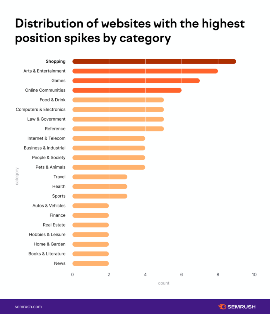 Według analizy Semrush wśród 100 domen, które osiągnęły największy wzrost po aktualizacji z lipca, aż 30% dotyczyło branż: zakupowej, rozrywkowej, gier oraz społeczności internetowych.