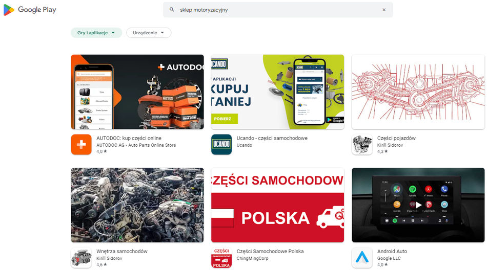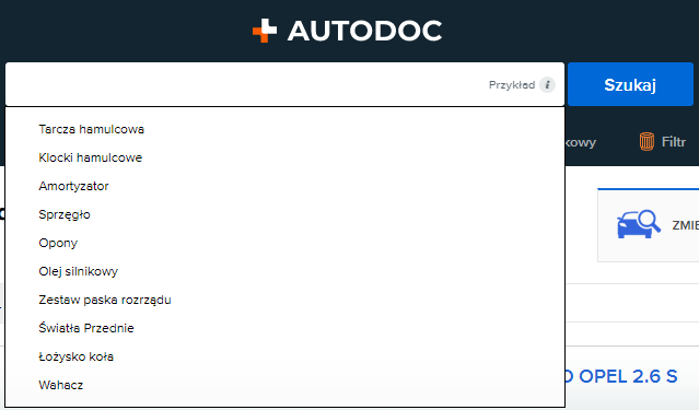 Autodoc.pl w swojej standardowej wyszukiwarce podpowiada użytkownikom kategorie: