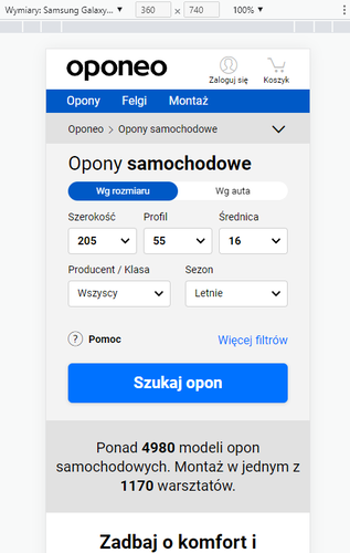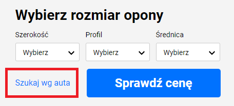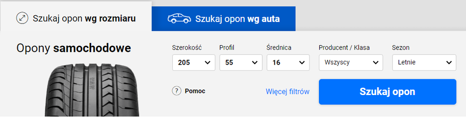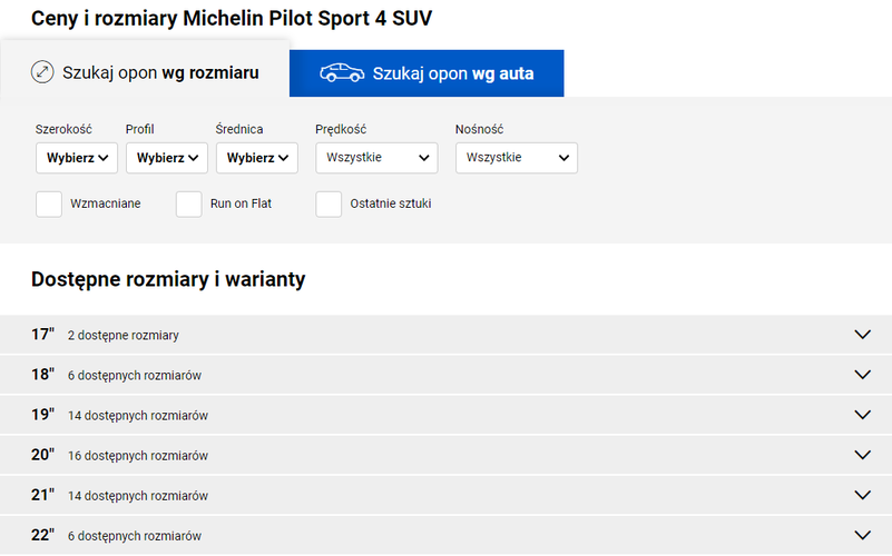 Gdy przełączymy na szukanie opon według rozmiaru, otrzymamy: