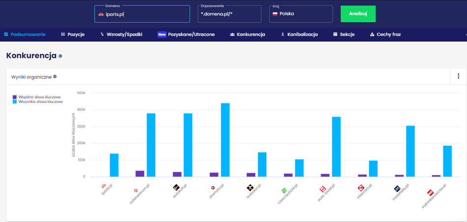 Istnieje wiele narzędzi do określenia konkurencji. Pierwszym z brzegu jest Senuto, które umożliwia błyskawiczne znalezienie konkurentów na podstawie wspólnych fraz. Poniżej widok, który zobaczymy, wpisując domenę iparts.pl: