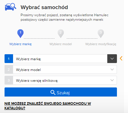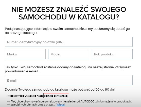 Co jeśli nie znaleźliśmy w wyszukiwarce swojego auta? Wtedy mamy możliwość wysłania takiej informacji do sklepu: