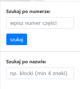 Na stronie https://e-autoparts.pl/ widoczne są 2 wyszukiwarki, gdzie można szukać po nazwie części lub jej numerze: