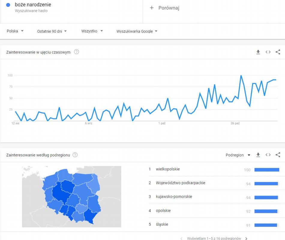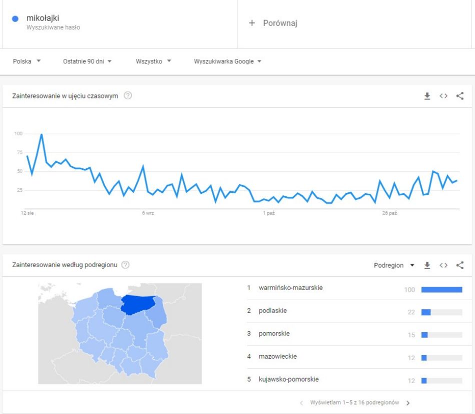Jeśli przyjrzysz się Google Trends, to w przypadku hasła „Mikołajki” już na początku listopada zaczął się trend wzrostowy. Co ciekawe – największym zainteresowaniem cieszy się ono w woj. warmińsko-mazurskim. Choć w tym przypadku może to być bardziej kwestia turystyki niż e-commerce.