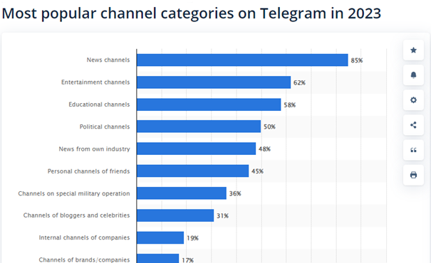 Źródło: https://www.statista.com/statistics/1252771/leading-telegram-channels-by-category/