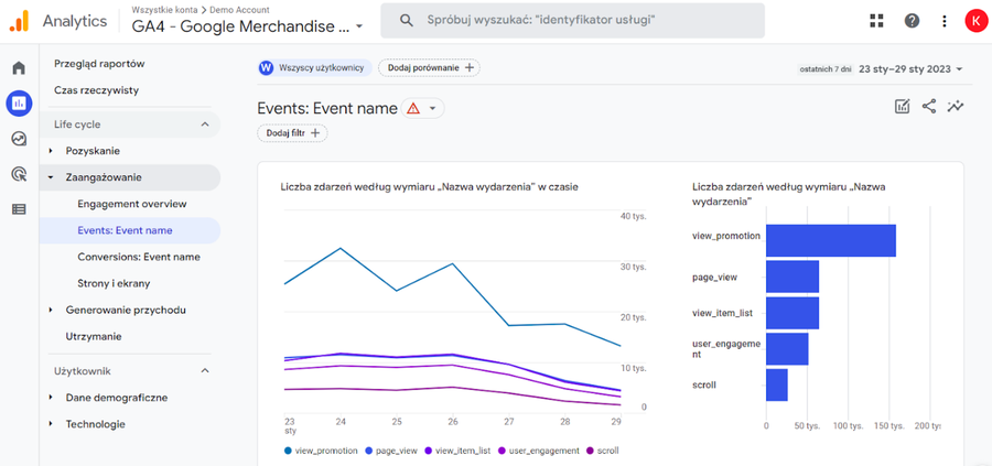 Źródło: Konto demonstracyjne Google Analytics 4. Raport zdarzeń https://analytics.google.com/analytics/web/.